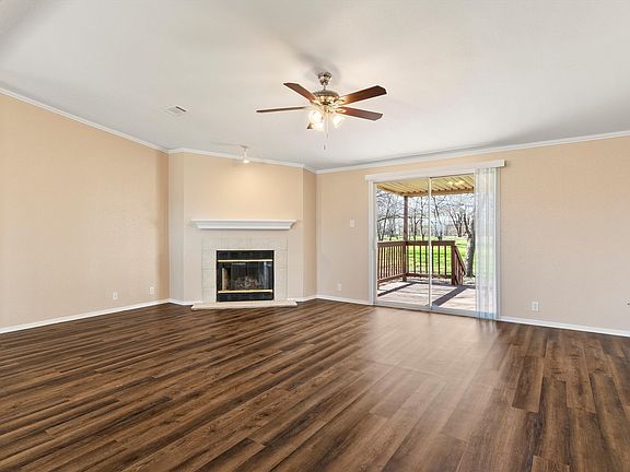 Acclaimed Northwest ISD! Beautifully remodeled and freshly painted home nestled on a quiet cul de sac sitting on .85 acres with an extended driveway for plenty of parking. Enter into an oversized living area featuring recently updated wood look vinyl flooring, corner accented fire place with a tiled frame, and views of the back patio and sprawling land. The masterful open concept style kitchen showcases white cabinets, a tiled backsplash, electric cooktop, stainless steel oven and microwave, breakfast bar, prep island and tons of counter space. Primary suite is over sized with a sitting area, study desk and storage cabinets, cool ceiling fan, window blinds and a private en suite bathroom featuring jetted tub, expansive closet and dual vanities. Secondary bedrooms feature wood look flooring and spacious closets. NO CARPET! Full sized laundry room. Out back, enjoy two covered patios, mature shade trees and ample space for outdoor enjoyment!