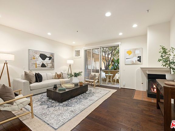 Presenting this special condo in a desirable building with a manicured courtyard, positioned just down the street from Beeman Park and the Studio City Recreation Center's picnic tables, tennis courts, basketball hoops, baseball diamonds, and playground shaded by giant California oaks. Inside this interior-facing unit, an elegant living room is highlighted by a corner fireplace near sliding glass that opens to a private patio for relaxing to the sound of the calming fountain nearby. The kitchen is appointed with copious cabinetry and counter space, stainless-steel appliances, and eat-in breakfast area adjacent to the formal dining room. The primary bedroom has an accent mirror wall that reflects natural light as well as plantation shutters that open to reveal lush greenery outside, creating a resort-like ambiance. There is also a second patio surrounded by lush landscaping. The sumptuous en-suite bath is appointed with a dual-sink vanity, jetted tub, and large glass-enclosed shower, and the walk-in closet features built-ins. The secondary bedroom and bathroom continue the home's coastal resort-like vibe. Stackable laundry is found in unit, and building amenities include a sauna plus pool and spa. Welcome to this prime location close to the Sportsmen's Lodge shopping center, anchored by Erewhon and Equinox, and just moments to Ventura Boulevard's shops and boutiques, the 101 Freeway, and more.