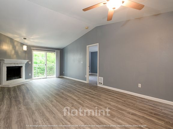 This updated 2-bedroom, 1.5-bath condo offers 980 sq ft of comfortable living in a serene, park-like setting. The open living and dining area features vaulted ceilings, modern flooring, a cozy decorative wood-burning fireplace, and large sliding doors that lead to a private balcony overlooking lush greenery. The kitchen includes ample cabinetry and a breakfast bar that connects seamlessly to the main living space.