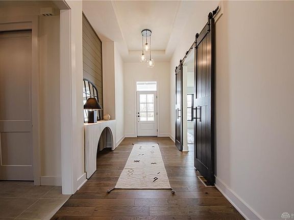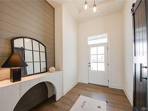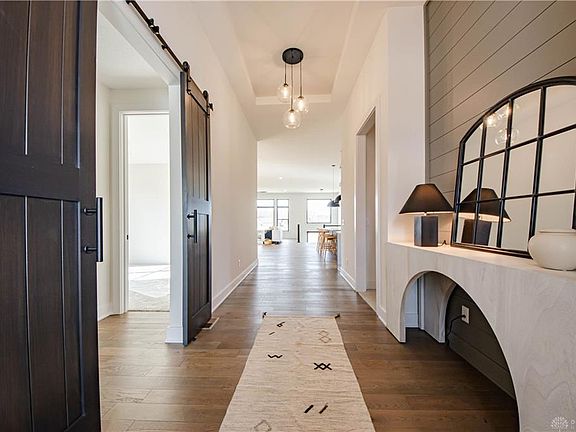 Luxurious, Custom built home by Design Homes! This luxurious home features a split bedroom floorplan with soaring 11ft ceilings in the open concept living area. There is elegant hardwood flooring throughout the Foyer, Great Room, Kitchen, and Dining Room. The Great Room is open to the kitchen and features a gorgeous floor to ceiling stone fireplace. The gourmet kitchen offers GE Stainless Steel Appliances, Quartz Countertops, Tile Backsplash and a Frosted Glass Pantry Door. The open floorplan includes a landing with a walkout to the private backyard and patio. The Primary Suite boasts split vanities, a freestanding tub, and an elegant tiled shower. The sprawling Walk In Closet in the Primary Bedroom offers convenient access to the Laundry Room. The Lower level has a Wet Bar with Granite Countertops, a large Rec Room, additional Bedroom, Full bath, and ample storage. Soraya Farms offers resort-like amenities including a pool, exercise room, clubhouse, walking trails, and stocked ponds. Additional features include a custom bench in the mud hall, a 95% High Efficiency Furnace, and 3 car garage.