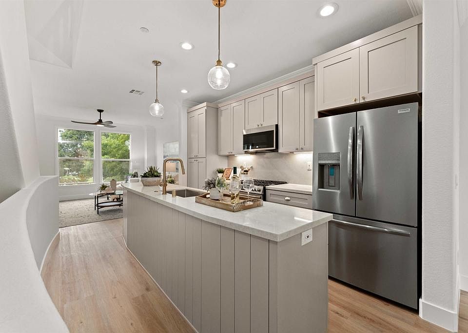 Designer finishesWalking pathsNeighborhood parkStylish brass fixturesCustom islandFresh modern interiorLarge windows