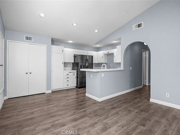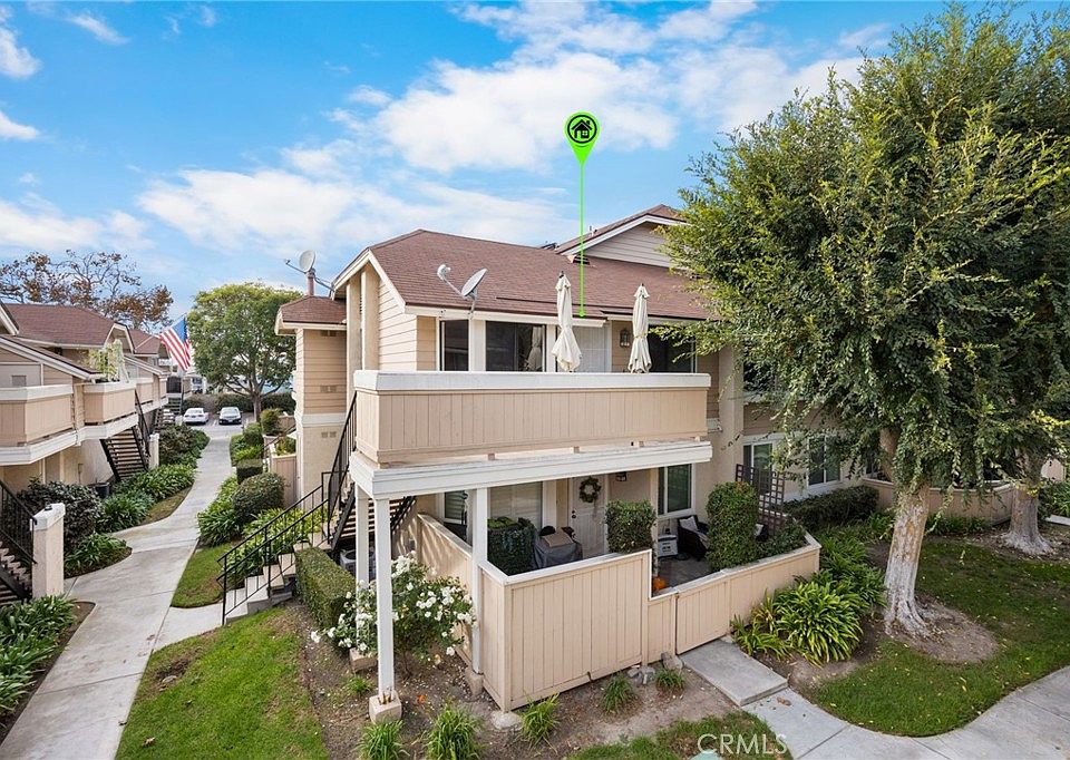 A charming 2 bedroom 1 bath condominium located in Stanton inside the gated community of Crosspoint Village. The condo is located further in from the Boulevard and streets and offers a much quieter location. The condo is has vaulted ceilings, laminate flooring and recently painted inside. This a great quiet and peaceful community with HOA amenities including several pools, spa, hot tubs and a green belt and lots of trees around the community. The home is on the second floor with a large master bedroom with a walk in closet and a large vanity next to the bathroom. There is a large landing at the entrance of the home.