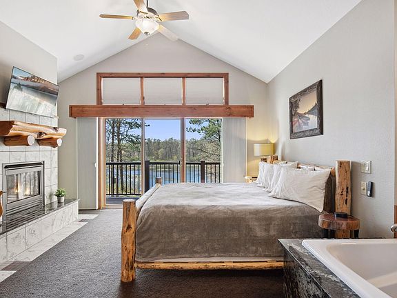 Gas fireplaceHeated floorsOne-level livingOpen family roomSprawling lakeside deckEnsuite jetted tubLog home