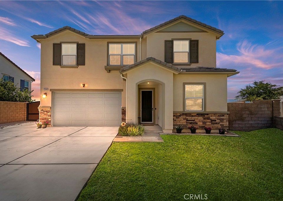 Are you looking for a home that sets itself apart from others in Grand Terrace? Your search is over at 12640 Jaden Ct. Grand Terrace. This beautiful two-story home built in 2020 comes with 4 bedrooms and an optional space for a 5th bedroom or a den, 3 full baths and provides panoramic views of Grand Terrace and the surrounding areas. Situated on a quiet street this home stands out with its impressive long driveway that offers side parking to fit two RVs and looks great with blocks walls around the home. The front covered patio entry is the gateway into the home. On the main level of the home, you have one guest bedroom and a full bath. To the rear of the home on the first level, you have an open concept living, dining and kitchen area that's perfect for your family. The kitchen has many upgrades and compliments the window shutters, allowing the bottom level to show beautifully. The second story living space has a nice size bonus/retreat area that is perfect for an entertainment den, a home office or 5th bedroom. There are two other guest rooms, a large in door laundry room, a full guest bath with a double vanity, separate latrine and shower area. The main bedroom is nicely sized and provides a gorgeous view of the city from its windows. The main bath has a double vanity, soaking tub and walk-in shower enclosure and the bonus of an oversized walk-in closet. This niche area of Grand Terrace comes with its own pocket park with walking paths. The home is located minutes from University of Riverside, Loma Linda University and Loma Linda Hospital. Conveniently located near to the 1-10, 215 and 60 freeways in addition to shopping, dinner and entertainment areas. The home comes with many upgrades that include Tesla Solar system - 2 backup batteries. window shutters throughout the home, premium flooring, marble backsplash in kitchen, quartz countertops, built in stove, water conditioning and filter system, wired internet, 3 ceiling AP’s, fiber optic internet thru ATT, double RV parking, security system - contact sensors, motions sensors, 5 exterior cameras, custom premium side and back gate, epoxy flooring in garage, hardscaping throughout, block walls on side and back of home and upgraded fixtures- handles, hardware from chrome to satin nickel and so much more.