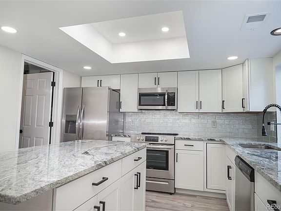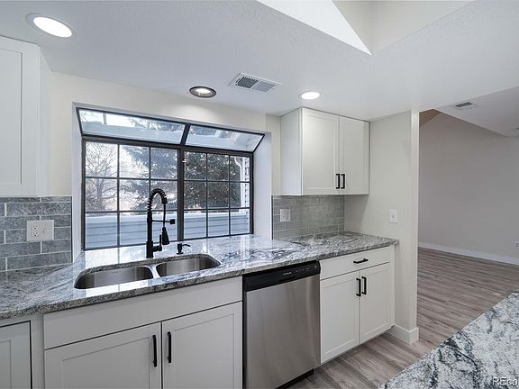 Wow! Just remodeled from top to bottom. One of the nicest homes available in Heather Ridge, Aurora’s premier location. 2 bedrooms plus 2 baths, finished floor lanai and 1 attached parking garage with remote. Updated and remodeled 2 bedroom, 2 bath floor plan. Large, open great room with wood fireplace and separate dining area and open kitchen with eating bar. Views from the living area and both bedrooms to green space and mature trees. Enclosed lanai for 4 season use. New kitchen with new cabinets, eating bar, granite counters and stainless appliances. New luxury vinyl laminate floors throughout the living areas. New baths with new fixtures, tile, cabinets and counters. New paint throughout. New hardware, lighting and fixtures. New Washer and dryer laundry. Close to the community amenities. Enjoy this beautifully redesigned home in Aurora’s. The neighborhood has been impeccably maintained by the HOA and features a swimming pool, clubhouse, tennis courts and a park and paid water. The location is 3 minutes to 225 and 8 minutes to UChealth.