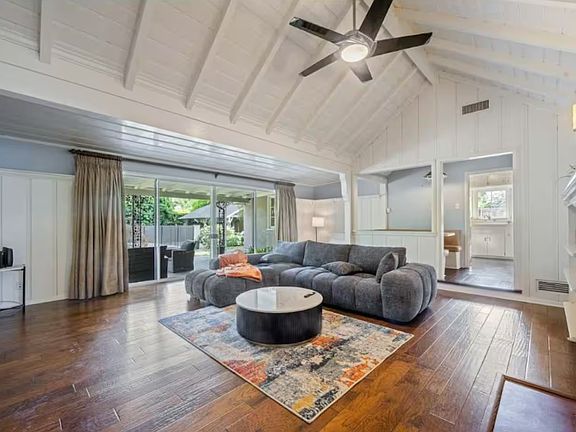 The home features a large family room with vaulted wood beam ceilings and a fireplace, seamlessly connecting to the original kitchen equipped with a built-in banquette. Sliding glass doors open to a majestic backyard, showcasing a custom pool and spa with a diving board and slide, multiple patio areas, mature fruit trees, and a sprawling grass area epitomizing the California lifestyle.