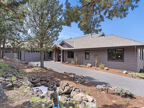 Stunning CASCADE VIEWS from this Awbrey Butte SINGLE LEVEL home with a 3-car garage! Custom features with an open floor plan, vaulted ceiling, stack stone gas fireplace w/built-ins, dining room, office w/ built-in desk & a bonus/media room. Kitchen w/Dacor stainless steel appliances, double ovens, 5 burner stove top, slab granite counters, farm sink, Medallion cabinets & pantry. Primary suite has views, a gas fireplace & door to the deck. Primary bath has dual sinks, tile counters, jetted tub, huge tile shower, & walk-in closet with built-ins. Home features include Sierra Pacific windows, central vac, AC, solid fir doors, Hunter Douglas cell shades, radiant heat in primary bath/kitchen & surround sound. Garage has workbench, built-in storage cabinets & attic storage space. Waterfall feature, 800 SF of composite decking & a patio w/ a hot tub. HEATED DRIVEWAY (paved strips) with 2 parking spaces & a flat driveway at the garage entrance. Plenty of storage under the house.