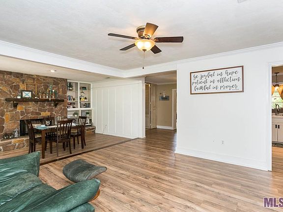 Charming, updated 3 bedroom, 2 bath home with Bonus room on 1.06 acres. Neutral paint colors make this home feel very comfortable and homey! There are wood floors throughout most of the home - NO carpet! Two large windows light up the Open living and dining rooms and showcase the attractive stone fireplace with hearth and built-in shelves on either side. Large updated kitchen has ample counter space and cabinets, pretty backsplash, gas cooktop, and a pantry. Adjacent, spacious laundry room has upper cabinets & a utility closet. Off the kitchen is the huge Bonus room currently set up as a game room (pool table remains), with built-in bar, wainscoting and boxed-style ceiling. Two sets of double doors lead to the private open patio and an adjacent 14 x 12 covered patio, perfect as a grilling area. The master bedroom has 2 closets, ceiling fan and an ensuite bath with custom shower. Hall bath features ceramic tile floor, vessel sink, framed mirror, and tub/shower combo with custom tile surround. The lot includes a 30 x 30 storage building and small garden shed.