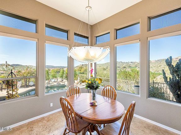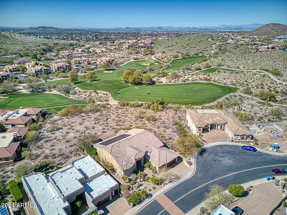 The elevated, hillside location delivers unparalleled sunset, golf, and mountain views in a gated community overlooking Lookout Mountain Golf course. This Ridge at Lookout Mountain property surrounded by scenic beauty, is now freshly painted, with a clean, modern ambiance, grounded with natural stone flooring and flooded with natural light through panoramic windows. The kitchen features custom cabinetry and high-end SubZero and Wolf appliances. Owned solar = sunshine pays the bill. A split owner's suite is a lavish escape with hardwood floors, sitting area, gas fireplace, dual walk-in closets, jetted tub, and snail shower. The low-maintenance yard enhances outdoor relaxation with a covered patio, pebbletec pool, built-in BBQ, and artificial turf, creating a perfect retreat. A new roof, tankless water heater, all new smart locks, shutters, invisible screen doors, electronic window screens, both a water softener and reverse osmosis, new insulated garage doors, two pergolas, gutters and a backyard gate are recent improvements. Overall, this residence combines modern elegance, integrated with its natural surroundings, offering a luxurious and tranquil lifestyle for those seeking a sophisticated home with breathtaking views and upscale amenities.