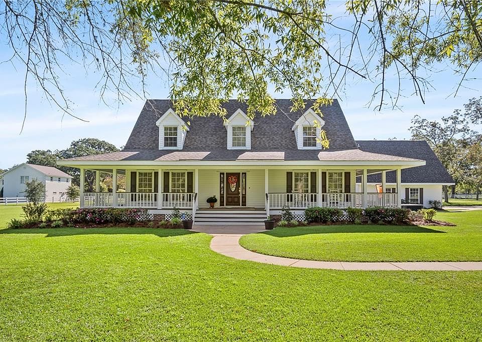 Welcome to Dominion Estates where this creole plantation home resides on ~5.5 acres with lots of trees--64 Pecan trees, 16 Live Oak trees & crepe myrtles! The 1.5 story home sits on piers with a wraparound porch and features almost 2700 sq ft with 3 bedrooms, 2.5 bathrooms as well as a ~400 sq ft garage apartment featuring a bedroom, bathroom and tiled office suite with bookshelves. Luxury vinyl flooring (LVP) throughout living areas. Formal dining room. Kitchen has tile floor, wood cabinets, granite counters, gas range, dishwasher, microwave, refrigerator, eat-in breakfast room. Panty/utility room off kitchen includes washer/dryer. Living room includes a gas fireplace and overlooks back deck and yard. Powder room is located on first floor for your guests. Primary bedroom suite offers a wood burning fireplace, lots of windows, ceiling fan, 2 sinks, large walk-in closet, tile floor with shower, soaking tub. Upstairs has all new carpet as well as the 2 guest bedrooms and a hall bathroom with a shower as well as a tub/shower and 2 vanities. Large back deck with pergola is ideal for entertaining and relaxing. White rail fence on 2 sides of property. 1 car detached garage. Gutters. Hurricane shutters. 30x40 insulated Barn with electricity. Roof 2019. City water. Well for irrigation. Septic tank. Security system. AT&T fiber optics. No HOA. Restrictive covenants. 5 horses are allowed. Boat launch facilities within close proximity--1 mile to Weeks Bay launch & 1.8 miles to Pelican Point Launch. All information deemed reliable and accurate. Buyer to verify all information during due diligence.