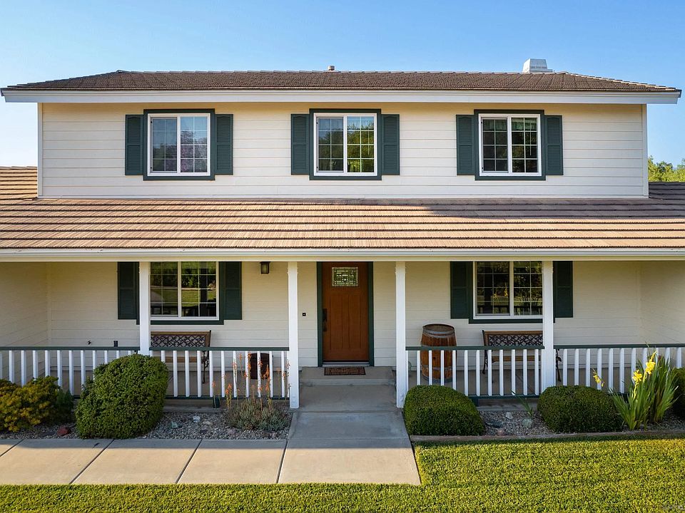 This custom-built house is situated on 2.55 acres of flat land, offering ample room for outdoor gatherings. Possibility for an ADU, a vineyard, or even an equestrian horse arena. It features a pool, next to a stylish deck. Did we mention the pool solar panels? It is surrounded by beautiful landscaping including orange and lemon trees. Be ready to unwind on the porch and enjoy the serene views of the surrounding area. Inside, the kitchen is thoughtfully designed to maximize storage capacity. Enjoy getting cozy in front of the wood burning fireplace on chilly days. This spacious 2,630 sq. ft. home includes 6 bedrooms, with the master bedroom being downstairs. Large windows throughout the house allow natural light to flood in, further enhancing the stunning views from every room. This property offers a perfect blend of indoor and outdoor living, with a pool, a shed, wood burning fireplace, 6 bedrooms, porch in both the front and backyard, on flat land, and with beautiful views.