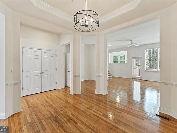 Back on the Market with Fresh Updates! Recent repairs have been completed, and the upper (bedroom) level now boasts new, neutral-colored carpet-making this stylish 3-bedroom, 3.5-bath townhome truly move-in ready. BONUS: No rental restrictions, offering valuable flexibility for future use or investment. Nestled in one of Smyrna's most vibrant, amenity-rich communities, this residence spans three finished levels of versatile living space and offers direct access to the Silver Comet Trail for outdoor enthusiasts. Each bedroom comes with its own private bath, an ideal setup for guests, roommates, or multigenerational living. The primary suite provides a true retreat with a spa-like bath featuring double vanities, a soaking tub, separate shower, oversized walk-in closet, and elegant trey ceilings. The main level is designed for everyday comfort and entertaining with hardwood floors throughout, a bright open layout, and a chef's kitchen with stainless steel appliances, island seating, breakfast area, and abundant cabinetry. A formal dining room, spacious living room, and sunroom (perfect as a home office) flow seamlessly together. Step outside to your private back deck for morning coffee or evening relaxation. On the terrace level, you'll find a private bedroom with a full bath-perfect for guests-plus flexible space for a gym or media room, along with convenient access to the attached 2-car garage. Community amenities enhance the lifestyle with a swimming pool, clubhouse, park with seating, community library, and direct trail entry for walking, running, or biking. Whether you're seeking low-maintenance living or space to spread out, this home delivers it all in one of Smyrna's most desirable neighborhoods.