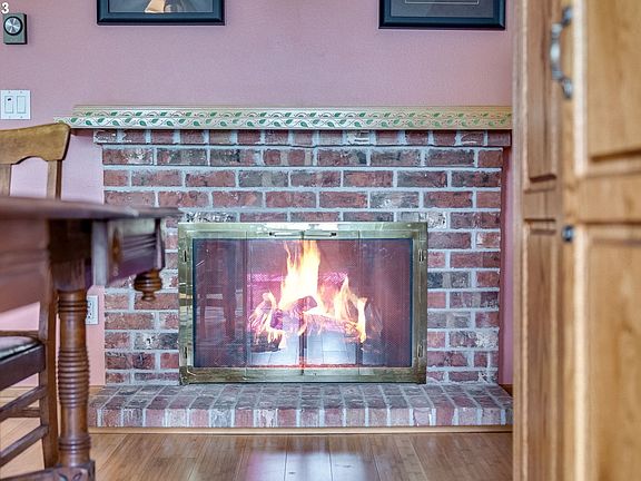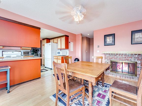 Enjoy sprawling Mt Hood & city views from this spacious top floor, 1-level unit boasting a large patio off of the living room & informal dining room through the 3-pane floor to ceiling window with slider. Enter into the formal dining room with wood burning fireplace or use it as a second living room. Flow into the U-shape kitchen with ample storage and lots of light from the sink window and overhead lighting. Ample space in the guest bedroom welcomes you off the hallway as well as the hallway bathroom and laundry leading to your primary suite at the end of the hall to enjoy the privacy of a spacious room, a full wall of 2 closets with ample floor to ceiling closet space and the private attached bathroom with walk-in shower and granite counter with undermount sink. Condo includes 2 large storage areas; one off the patio and one in the basement. Active 55+ community