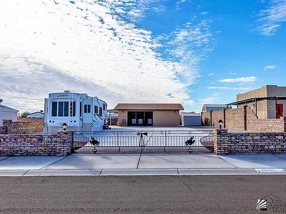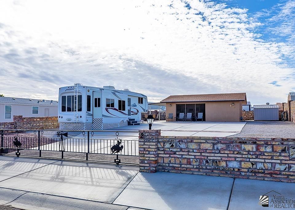 Amazing Yuma Foothills Lot with huge concrete drive and beautiful Support Building built by Hardin Development with 684 SQ FT. This custom property has a very open living area with garage style door that is fully screened when open. This room includes a kitchen area with refrigerator, dishwasher, microwave with gas range/oven just outside, plus a very spacious bathroom with walk-in shower. Included is a 2005 38' Keystone Everest with 4 slides and is in immaculate condition. Fully fenced with sliding double gate, storage shed, awning, brand new water heater and everything is permitted!