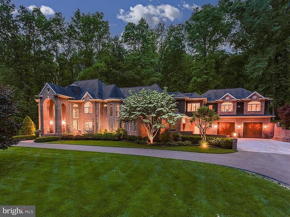 Magnificent estate in the coveted neighborhood of Triadelphia Woods that leads with its stately curb appeal, grand entertaining spaces, and considerable private quarters. Quietly set beyond a vast wooded driveway you are welcomed to this brick and cedar home with distinguished turrets and beautiful park-like hardscaping and landscaping with Japanese Maple trees and azaleas in a private setting. Perfectly situated on over four acres, this unforgettable and custom designed property spans over 8,000 square feet of well-curated living space with an in-law/guest suite. Sophisticated moldings, lofty windows, soaring ceilings, hardwood flooring, custom built-ins, and generous room sizes are just a few of the outstanding features awaiting you. The grand foyer is a breathtaking welcome to this elegant home, catching your eye immediately with its gleaming marble floors, circular skylight, and curved staircase with iron balusters. Anchored on one side of the foyer is the exquisite living room embroidered with custom crown moldings. On the other side of the foyer is the formal dining room, a wonderful entertaining area well-suited for celebratory meals highlighted by crown molding and chair railing. With an impressive two story ceiling, the family room is a bright and comfortable room that has been outfitted with a wood-burning fireplace with floor-to-ceiling stone surround flanked by striking stacked windows. The eat-in gourmet kitchen is spacious and well-appointed with granite counters, stone backsplash, 42-inch cabinetry with rope molding and under cabinet lighting, a center island with prep sink, high-end appliances including a gas cooktop with range hood and additional paneled Sub-Zero refrigerator drawers in the island, planning station, and breakfast nook with two story windows overlooking the stunning backyard. Adjacent to the kitchen is a full bath with granite counter and an exceptional room perfectly suited for a home office, den, or main level guest room. The main level is concluded by a powder room, laundry room with ample cabinetry, folding counter, and sink, and a built-in drop zone.The substantial upper level is an exciting collection of 5 bedrooms, 4 full baths, and a sitting room at the top of the main stairs with a tray ceiling, bookcases, custom bench seating, and incredible overlooks onto the foyer and family room lined in iron balusters. Travel upstairs using one of the three staircases and into the primary suite. The primary suite is graced by a sitting room with distinguished built-in bookcases, a sizable bedroom with slider to the upper deck, tray ceilings, and large walk-in closet with built-in storage system. The spa-like primary bath highlights a double vanity, jetted soaking tub, and separate floor-to-ceiling tiled shower. Three additional generously sized bedrooms, one with an en-suite bath, and a full hall bath with double vanity concludes the main sleeping quarters. The other wing of the home offers the in-law/guest suite characterized by an expansive bedroom with window seating and river rock fireplace, wet bar with cabinetry and mini fridge, full bath, separate water, HVAC, and attic. The sprawling lower level presents an exercise room, full bath, recreation room, media room with fireplace and built-ins, custom brick arch wall inset, and wet bar with granite counters, beverage fridge and dishwasher, ideal for entertaining. The lower level also offers walkout access, a cedar closet, and spacious storage room. Enjoy spring and summer on the decks with modern glass panel railings that allow for an unobstructed view of the scenic backyard. Host the best outdoor gatherings on the exquisite tiered stone patios with waterfall and firepit. Additionally, this home features 1-car and 2-car garages with artisan doors, beautiful brick exterior archways, custom stone parking courtyard off the circular driveway, and a climate-controlled outdoor utility room.