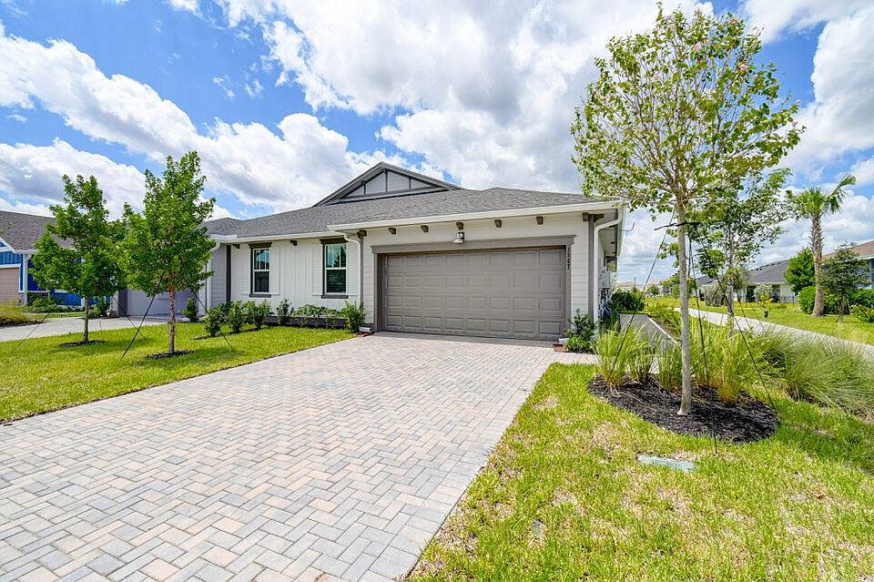 Charming 3/2/2 corner villa with serene park-like views. Spacious floor plan with neutral color palette flooded with natural light. Ceramic tile throughout living areas. Beautiful white kitchen cabinets with elegant quartz counter tops and stainless steel appliances including a gas stove. Enormous walk-in pantry. Other features include smart home features, an abundance of storage space, impact windows, and an open and covered patio. Gated community with resort style amenities. Excellent, A-rated schools and brand new, Saddle View Elementary .