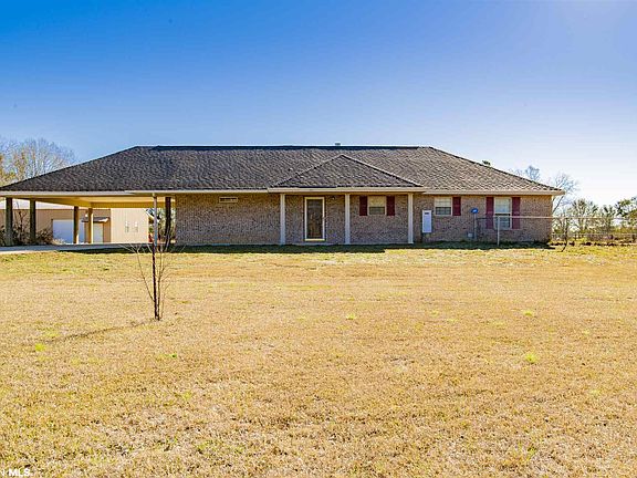 Quiet home on 4.79 acres in Elberta. 3 bedrooms 2 baths with an open floor plan, large laundry room, wood burning fireplace, and stainless steel appliances. Master bathroom has large his and hers walk in closets and a huge tiled shower. Long driveway lined with trees opens up to a spacious yard with a large carport and back porch. 36 x 40 barn with a 12 x 40 lean to that has its own power meter with one 36 walk in door and 2 9 tall by 10 wide roll up doors. Conveniently located to Pensacola, and Foley. Just a few minutes to Elberta Schools, and right down the road from the brand new Elberta sports complex.