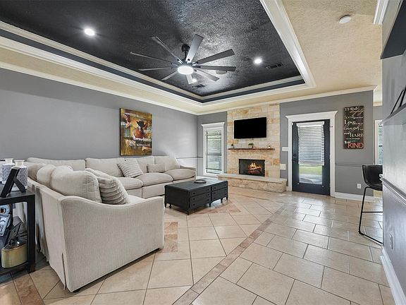 Beautiful gas fireplaceTray ceilingsHuge gameroom with fireplaceStainless steel vent hoodCovered back porch