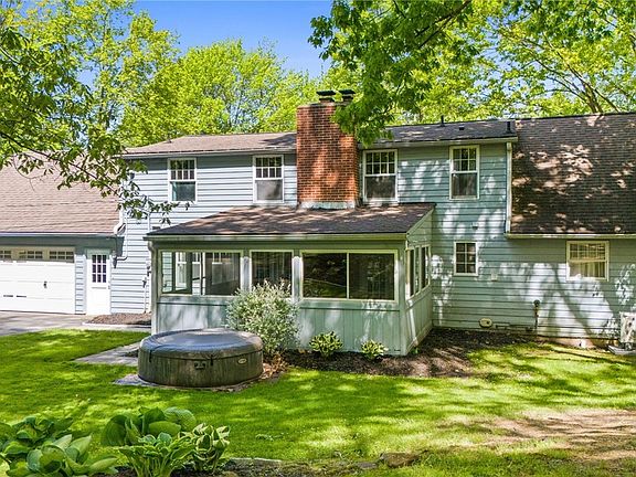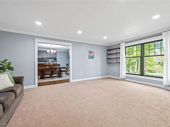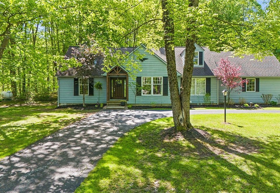 Meticulously Maintained & Beautifully Updated Cape Cod nestled on 5+Private Acres! This warm & inviting home offers great living space with 5 Bedrooms, 2.5 Baths, refinished hardwood floors, solid wood doors, all new base trim and thoughtful finishes throughout. Remodeled covered front entrance welcomes you into the bright & light Living Room & Formal Dining Room with crown molding. Kitchen with granite island breakfast bar, new backsplash, updated lighting/fixtures, pantry and all appliances stay. Family Room with new cedar beams, remodeled fireplace/tiled hearth, recessed surround sound speakers and double french doors open to the 3-Season Sunroom with wooded views. 1st floor Master Bedroom and Master Bath with double sink vanity and oversized ceramic shower. Second floor includes custom shiplap ceiling, 3 large bedrooms with newer carpeting, full bath, reading nook in hallway & walk-in closet to attic storage. 1st floor laundry room with new cabinets & flooring. Full basement includes finished Rec/Play Room, 5th Bedroom and great storage space. Many other improvements include: New heat pump 2023, water softener/osmosis system 2021, new front door, updated lighting & fixtures and much more. Surrounded by mature trees with expanded hiking/ATV trails & stone firepit. Paved circular driveway, 2+car attached garage plus 32x24 freshly painted outbuilding with new windows, electric & water. Set on quiet private street and close to NDCL, YMCA, Apine Valley, Fowlers Mill Golf Course, Geauga Parks and just minutes to Chardon Square!