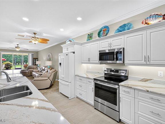 This luxurious St. Andrews model home features 2 bedrooms, 2 bathrooms, a den, 1,856 square feet of living space, a 2-car garage, and an extended lanai. With over $100,000 in upgrades, the home boasts a fully remodeled open kitchen equipped with new cabinetry, premium countertops, new appliances, stylish lighting, tile flooring, and a huge island complete with a built-in double sink, seating and extra storage. Safety and comfort are prioritized with new hurricane impact windows, roll-down shutters and electric screen to protect the lanai. Additional enhancements include a new washer and dryer (2025), ceiling fans throughout, crown molding, new water heater (2023), and a den/flex room featuring a built-in office desk and a Murphy bed. The master suite offers an indulgent retreat with His and Hers walk-in closet, sitting area, dual sinks, a walk-in shower, garden tub, and a mini-split AC unit for personalized comfort. The extended screened lanai offers the ultimate in outdoor Florida living, providing a spacious covered area along with an added patio space for enjoying the sunshine or entertaining family and friends. Located in the charming Stoneybrook at Gateway, a gated community with a manned gatehouse, residents enjoy access to a large community pool, spa, fitness center, lighted tennis courts, pickleball, basketball, volleyball, parks, and more! The low HOA fees encompass all amenities, community events, security, and Xfinity Digital Cable & Fiber Optic Internet! The Villa homeowners' association adds convenience by including lawn/landscaping with irrigation, exterior pest control, roof repairs and replacement.