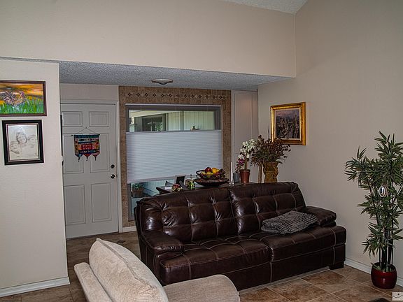 Highly upgraded unit - owners spent $20,000 to install Anderson windows throughout the home. Set back from the street with the front door access off a small, unnamed cul-de-sac, this home is quieter than those facing the street. Upgraded kitchen (oak cabinets and Corian-like counters) and baths with a shower stall in the master bath. The living room has high, cathedral ceilings, boasts a converted-to-gas-log-only fireplace, & adjoins the dining room with similar ceilings. Large windows & a sliding glass, door provide plenty of light to the living room. Just off the entry is a third bedroom that can double as an office or reading room. The dining room also opens directly to the kitchen for ease of serving and quick access to forgotten condiments while eating. Both the living room and kitchen overlook the enclosed patio. Gas cooking makes food prep easy and there is a built-in microwave over the stove/oven. A ceramic tile backsplash all the way up to the cabinets affords easy cleaning. The large master bedroom accommodates a California-King sized bed and has direct access to the patio via a sliding glass door. The laundry is in the hall, conveniently located between the two main bedrooms. The patio is mostly concrete with an area of paver bricks. The two-car garage is accessed via the kitchen and leads out through a private driveway to the main street. There are some shutter/blinds in the front bedroom. The furnace and AC unit were replaced 10 years ago and the water heater was upgraded six years ago. There is a 10x10 umbrella in the courtyard that stays with the property and a small freezer in the garage that stays, as well. There is some upgraded lighting in a few rooms and the home was recently painted. The association provides exterior maintenance as well as two pools, snow removal, RV storage, and more. Both out the front door and across the cul-de-sac, as well as nearby in the complex, are open green-spaces with no buildings - convenient places for a picnic, reading, sunning, or an area for walking pets. The complex is very close to a variety of shopping facilities on McCarran, within walking distance if you're so inclined. If you're looking for quiet, convenience, limited maintenance, and single-story living, this home is for you!