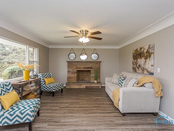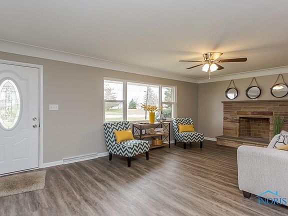 Super sharp, newly renovated brick Oregon ranch on a nearly one-acre lot New kitchen with laminate floors and stainless steel appliances. Dining area with built-in. New full bath custom tile and LED/BlueTooth light. Spacious living room with beautiful cove ceiling and wood-burning fireplace. New windows, glass block, 100-amp electric, plumbing, carpet and interior paint. Newer furn/AC and roof. Full basement. Covered rear porch overlooks private yard/field. 2-car attached garage with attic storage. Immediate possession