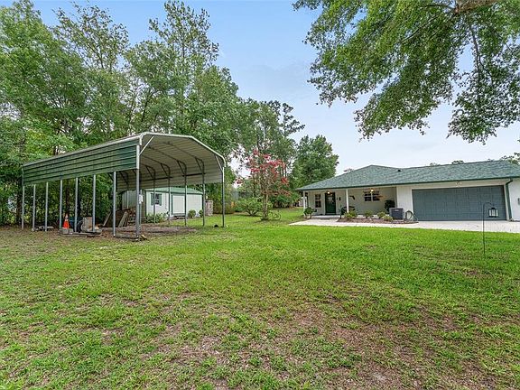 Looking for your private oasis on .62 acres and close to everything? This is it! This meticulously maintained 3-bedroom + office, 2-bathroom home sits on a rare double lot with no neighbors on one side—thanks to a neighboring retention pond that ensures privacy and protects against future development. The inviting side porch features a charming swing, while the enclosed front porch has been thoughtfully converted into a bright, functional office space. Inside, you’ll find vaulted ceilings, newer flooring throughout the main living areas, and a spacious, well-designed layout. The primary suite includes double vanities and a generously sized walk-in closet. A separate indoor laundry room with a utility sink adds everyday convenience. Major upgrades include a newer A/C and water heater, a water softener system, and a roof that’s just one year old. Outside, the property offers both an attached 2 car garage and a detached two-car garage with electric, an additional powered shed, and a cleared backyard with no overhanging trees—providing peace of mind during storm season. Additional features include gutters, a sprinkler system, well and septic, and plenty of room to spread out. This home blends comfort, privacy, and long-term peace of mind. Did I mention no HOA? Located 15 minutes from The Villages and 15 Minutes from Ocala for the best of both worlds!
