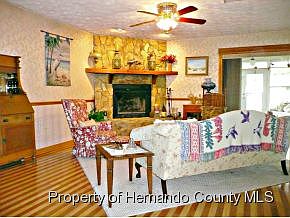 Active with Contract. Country Ambiance with Convenient Location 3/2/2 plus 2 car detached garage or workshop added in 2005. Half acre lot landscaped with fenced rear yard. Great room with wood floors and stone fireplace. Eat in Kitchen with wood cabinets, large dining room, large thermopane- glass enclosed lanai with heat/air overlooking koi pond and beautiful rear yard--fruit trees, shed, no build in rear.Space for R/V. Close to shopping and Suncoast Pkwy.