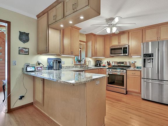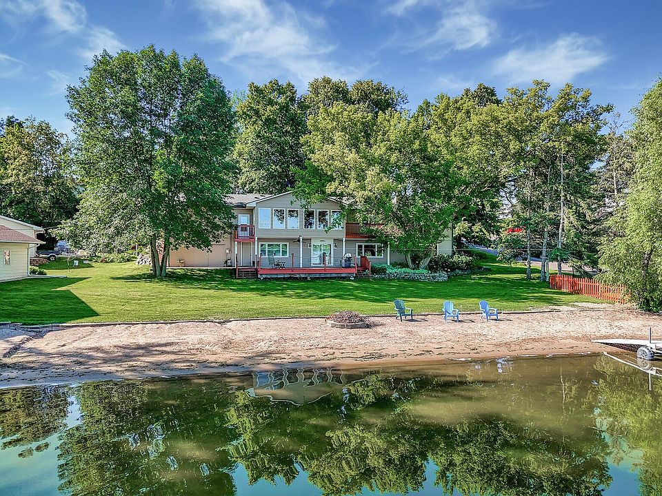 Welcome to the lake! Ideal walkout rambler with 120'+ of sand beach; 18x20 lower level shop/boathouse; spectacular views! Located on chain of full recreational lakes, over 1500 acres of fishing, boating & swimming fun! Spacious main floor primary bedroom, recently remodeled kitchen, porch decks, patios. It has it all. Close to town for shopping and services.