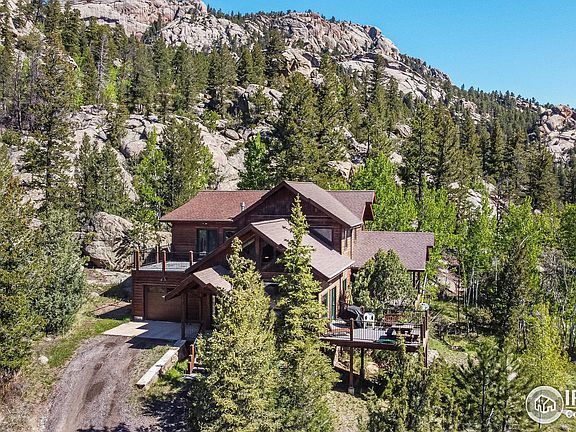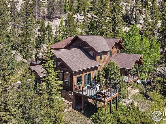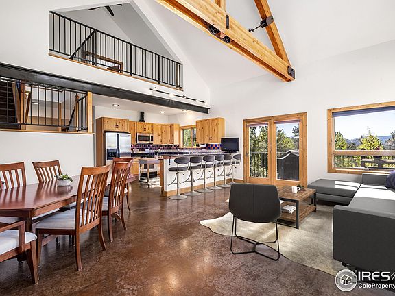 This custom home in the North End of Estes is perfectly positioned alongside Rocky Mountain National Park. The soaring vaulted wood beam ceiling enhances the sense of space and openness. Enjoy the convenience of main-level living with polished concrete floors warmed by radiant heat and a seamless flow from the open floor plan to the expansive main deck. The primary suite offers a spacious bathroom with a jetted tub and a private deck, while the versatile second room on this level can serve as a media room or home office. On the upper level, discover additional bedrooms, a loft space overlooking the downstairs, and the walk-out deck provides stunning views of rock formations and peaceful natural surroundings. The basement includes a handy workshop and abundant storage. Located in a quiet neighborhood yet close to the amenities of downtown Estes Park. Schedule your tour today! (Note: Some photos are virtually staged).