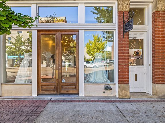 The main level features a beautiful retail space (bridal boutique) with 12-foot ceilings and large display windows, offering elegant storefront appeal, excellent visibility, and steady pedestrian traffic. Behind the retail space, a private courtyard connects to a detached carriage house with a studio apartment—ideal for rental income, guest accommodations, or creative use.