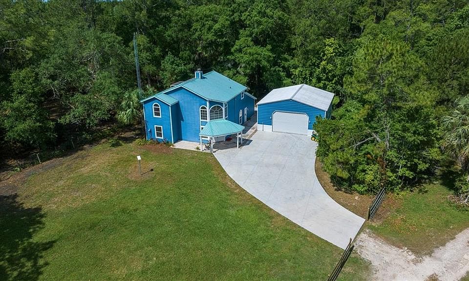 One or more photo(s) has been virtually staged. Back on the market and even better than before! Discover the best of both worlds in this beautifully updated one-owner home nestled on 5.42 acres zoned A1, perfect for animal lovers, hobby farmers, or anyone craving wide open space and privacy. Set at the end of a quiet drive, this 3-bedroom, 2-bath retreat is a hidden gem designed for those who love the land but don’t want to sacrifice style or modern updates. Step inside to a light-filled layout where fresh neutral tones, custom picture windows, and quality updated finishes bring warmth and calm to every corner. The fully remodeled kitchen is the heart of the home, featuring granite countertops, new stainless steel appliances, and countertop bar seating. The spacious family room connects seamlessly to the formal dining room through French doors, making it ideal for special gatherings. The formal living room’s floor-to-ceiling brick fireplace adds rustic charm and comfort, while two updated guest bedrooms and a modern full bath offer space for visitors or family. Upstairs, the private primary suite is a private retreat with a brand new spa-like bathroom boasting dual vanities, a soaking tub, and a glass-enclosed dual shower. An office loft and private screened-in deck overlooking the woods make it easy to unwind and work remotely. A portion of the front acreage is fenced, and there is a newly built 30x30 detached garage with electric that provides ample space for equipment, projects, or storage. Additional improvements include a 2014 solar-enhanced water heater, a 2025 water softener system, an annual termite bond, and a 2019 HVAC system. The durable metal roof, installed in 2014, ensures long-lasting protection and peace of mind. One-of-a-kind features like the handcrafted oak and ash staircase showcase the care and craftsmanship that make this home truly special. With agricultural zoning, this property offers endless possibilities for farming, livestock, or simply enjoying wide-open country living. The acreage extends all the way to Hwy 315, providing both convenience and opportunity for future use. Located just 15 minutes from Ocala and convenient to both I-75 and I-95, it’s an ideal home base for travelers, commuters, and equestrian lovers alike, especially with the World Equestrian Center close by. Survey and other supporting documents available, no HOA.