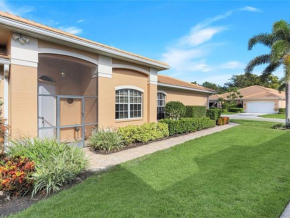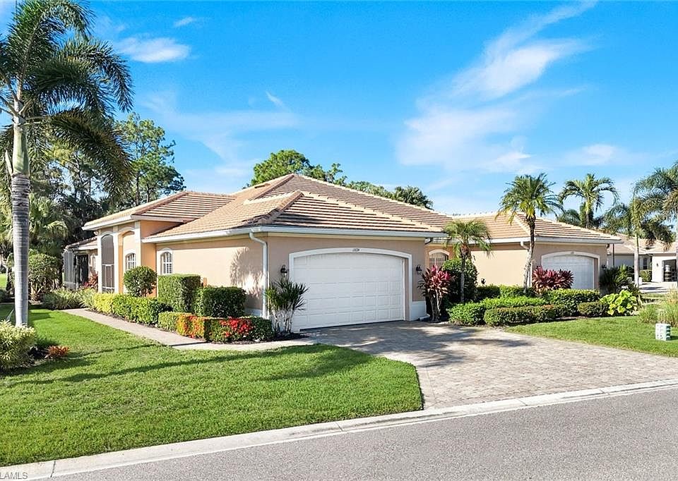 NICELY FURNISHED VILLA WITH GOLF MEMBERSHIP INCLUDED ($50,000 VALUE)! This beautifully updated and nicely furnished 3-bedroom, 2-bath villa offers 1,730 sq. ft. under air with a spacious open concept layout designed for both comfort and entertaining. Completely renovated throughout including the kitchen and both bathrooms, this home blends modern style with a warm, inviting atmosphere. The gorgeous kitchen opens to the great room and dining area, extending out to an expansive lanai ideal for gatherings or quiet relaxation. Enjoy a stunning view of the 17th green while being perfectly situated for privacy. The lanai also features electric hurricane shutters for added protection and security. Additional features include a newer A/C and water heater 2021 and a new roof (2017). Two car garage MotoFloor Modular Garage Floor tiles, very durable and easy to maintain! Golf membership is included, providing outstanding value and access to an exceptional golf and country club lifestyle. Hunters Ridge is a Private Golf & Country Club, not a bundled community with only 420 golf members, no Chelsea system and our golf member enthusiasts can play the course as often as they like! Hunters Ridge is very friendly, casual, and offers a large variety of social activities. Only 6 miles from Barefoot Beach Preserve! Just minutes to the best shopping, dining, entertainment, and the RSW Airport. 18 hole championship golf course, golf simulators, large community swimming pool with food & beverage service, community center, fitness center, clubhouse, beautiful dining room and grill room, poolside cafe, tennis courts, pickleball courts and much more!
