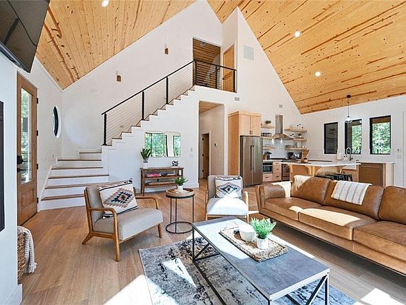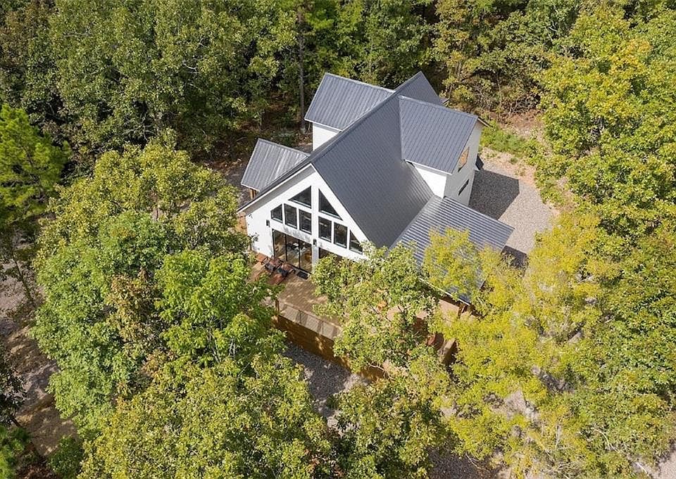 This luxury built A-Frame cabin is nestled in the pines and sits on 2.49 acres of wooded landscape. It was custom built and professionally designed with many luxury accommodations and Oklahoma comfort featuring 3 bedrooms and 3 bathrooms. Enjoy the views from the floor to ceiling a-frame windows spanning 24 feet or outside from the 800sq ft deck. The kitchen is complete with Quartz countertops, premium appliances, open shelving, and farmhouse sink. Large island with seating in addition to the dinning table. The staircase leads to airy loft; gathering space around tv, extra flex space, bunk beds, full bathroom enclosed by custom barn doors, and balcony to enjoy your morning coffee. The deck totals 800 sq ft and faces south for optimal sunset viewing. Equipped with fire place, chaise loungers, outdoor shower, gas grill, nordic hot tub, and open view to starry skies. The portion of the deck that wraps around to the kitchen is covered.Fully furnished! This listing won't last long.