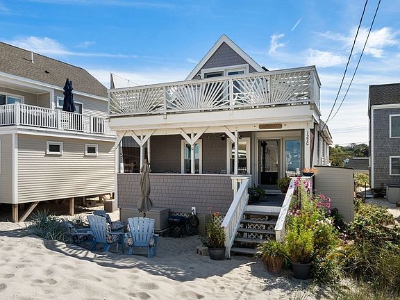 Nestled directly in the sands of sought after White Horse Beach, sits this sturdy cape/bungalow home, lovingly taken care of and updated by the same owners for decades. Relax on the porch or the balcony off the master bedroom and enjoy the ocean air and views. For more outside entertaining there is also a brand-new large PVC deck. The main first floor has an updated kitchen with cherry cabinets, Silestone countertops, gas range, and dishwasher. Ceramic tile floors throughout first floor living room, dining room, bedroom, and bathroom. The living rm has a gas fireplace, that works even if the power is out. Second level has the master bedroom, with skylights, and balcony, accessed by a spiral staircase. Rinnai on-demand hot water. Central air. Flood Insurance is $1,790. Sellers rent 1 parking spot for $500/year in nearby lot. There is also street parking with a town sticker and guest passes. House rests on concrete pilings with 2 ft x 1 ft thick concrete footings. Home being sold As-Is.