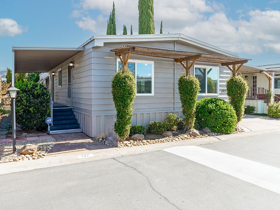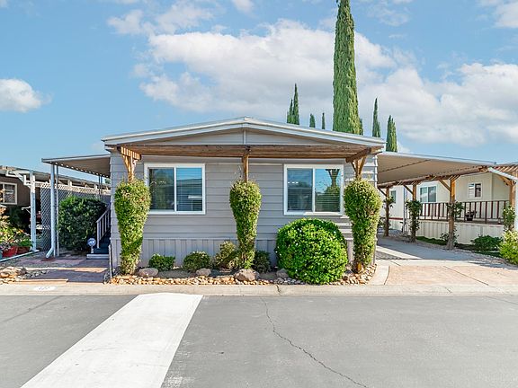 Charming 2-Bedroom Home with Open Floor Plan and Great Amenities in a well maintained 55+ community. This spacious 1,440 sqft home offers comfort and convenience with a thoughtful layout. Enjoy an open floor plan with two distinct living areasperfect for entertaining or relaxing. Step outside to a large covered front patio. Covered parking area with ramp and stairs to back door, and additional storage shed is along side the home. A tastefull wood trellis surrounds the home offering addition shade and privacy. The kitchen overlooks the front patio, and is open to the living area, and dining area. The primary bedroom features a private ensuite bath and a walk-in closet. The second bedroom has direct access to the second full bathroom, which also connects to the indoor laundry room for added functionality. This well maintained park offers a Community Pool, Clubhouse.