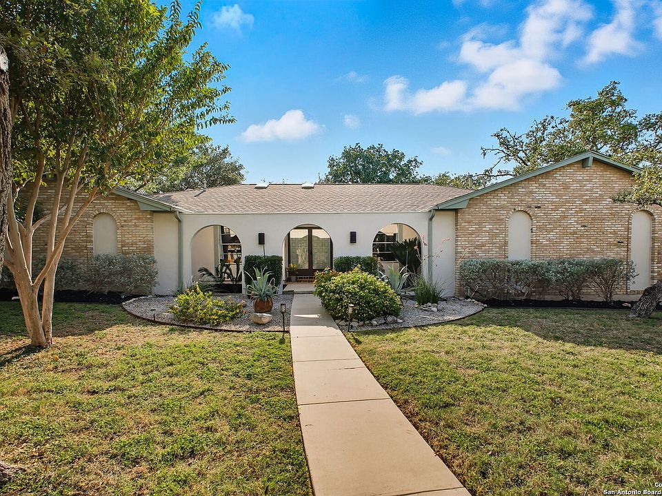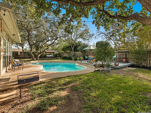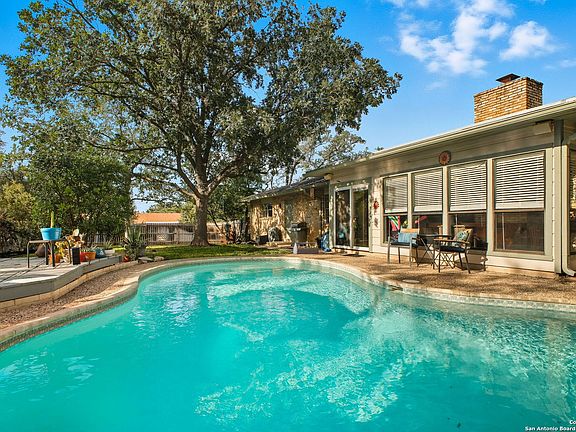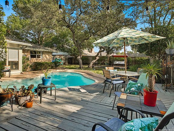 A rare gem in the heart of Hollywood Park, this one-story corner-lot home sits on a .50-acre lot and features 4 bedrooms, 3 bathrooms, two primary suites, a sparkling pool, 2 car garage, and outdoor deck and patio, blending modern upgrades with timeless charm. Step inside to an open floor plan with cathedral ceiling and three versatile living areas, perfect for a home office, game room, or additional family space. The spacious separate dining room is ideal for entertaining and family gatherings. The remodeled kitchen boasts stainless steel appliances, a gas cooktop (2020), and abundant cabinetry designed for both style and function. The primary suite includes dual closets and an updated Jacuzzi jetted tub and separate shower, with private exterior access. A second en suite bedroom provides flexibility for guests or multigenerational living. Stylish hardwood-look tile floors (2023) and refreshed interior trim add comfort and timeless appeal. The home is equipped with a well-maintained HVAC system for year-round comfort. Outdoors, enjoy a sparkling pool with deck and patio, perfect for entertaining or relaxing. Situated on a quiet corner lot in Hollywood Park, this home offers privacy and convenience, with close access to shopping, dining, parks, and major highways. Head over to Voigt Park, which includes three pools, two tennis courts, a full-size basketball court, sand volleyball court, splash pad, pavilion, clubhouse, and entry to Sonterra Golf Course.