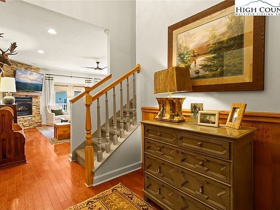 Beautiful, Centrally Located Banner Elk Townhouse! This home features 3 Bedrooms, 2.5 Bathrooms, and 1,895 sqft of living space with an attached garage, located in the heart of Banner Elk. Just a 60-second walk from your front door, and you'll have access to restaurants, shopping, and all the town of Banner Elk has to offer! Step inside and you'll immediately be greeted by a foyer with soaring ceilings and an elegant chandelier above. From here, you'll find a cozy living space with a natural gas-burning fireplace, which opens into the dining area with seating for six, and a modern, fully equipped kitchen. Multiple glass doors across the back wall flood the space with natural light and lead to a private patio for outdoor enjoyment. Upstairs, the luxurious primary suite boasts its own private balcony, a spa-like bathroom with dual vanities, a jacuzzi tub with its own fireplace, a walk-in shower, and a large walk-in closet. This floor also features an additional two bedrooms and a bathroom, with one bedroom featuring a closet that's been turned into a built-in bunk area for little ones! Washer & Dryer are on this floor too. Beautifully furnished throughout and being offered fully furnished by the owners, minus some select exclusions. This community is Airbnb/VRBO-friendly — perfect for those who wish to rent when not in use! Can't beat the location! Will go quickly! Inquire today!