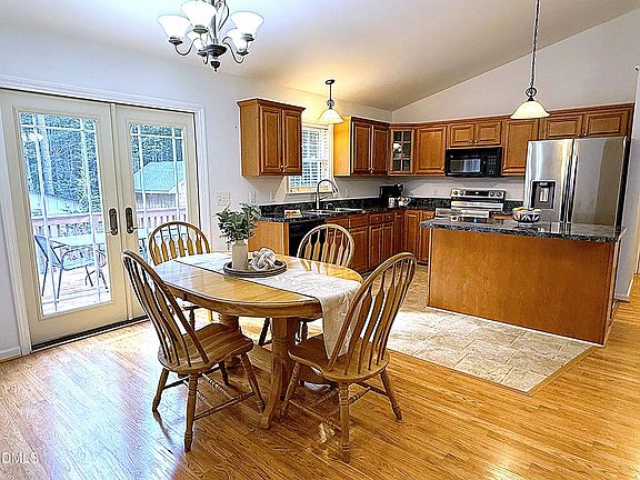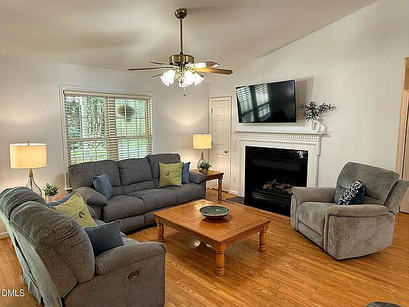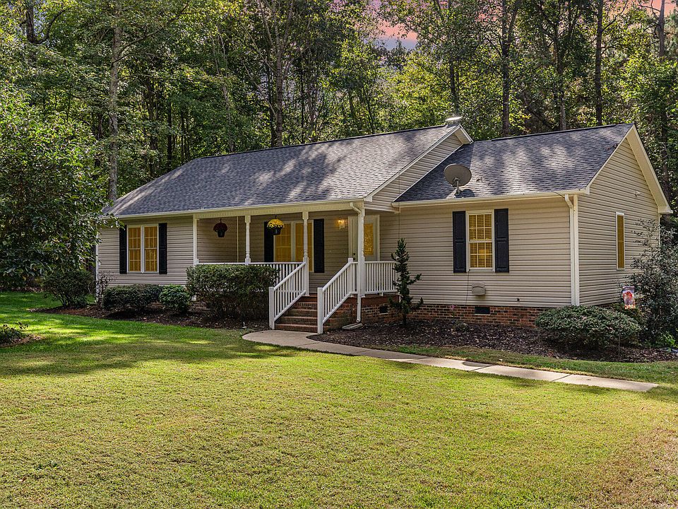 Charming single story living offering a retreat from everyday life! Step away from the hustle and bustle of RTP and embrace life simplified. Replenish your senses listening to the birds chirping and admiring boundless Azalea blooms as you enjoy your morning coffee on the ample front rocking chair porch this home provides. Nestled on just over 1 acre of land, this lovely, open concept 3-bedroom, 2 full bath single story home provides ample and comfortable living spaces. The spacious and airy living room area features cathedral ceilings and a lovely gas (propane) fireplace to gather around on those chilly winter nights. The dining room area may be set for 4 but comfortably accommodates 6 for every day and more for special occasions. Smartly designed with glass paned French doors that open OUT to the large back deck, clearance and convenient access to the outside from this space is not an issue. The spacious kitchen features a large center island, ample counter space and a new (2024 -25) stainless steel French door full-size refrigerator and 5 burner range which convey with sale! The enclosed laundry area holds a full sized (2024) front-load washer and dryer which also convey with sale, and overhead cabinets for convenient and discreet storage. A surprisingly large primary suite occupies the entire south wing of the home and features a large en-suite bathroom with both soaker tub, convenient make-up vanity and separate enclosed area for the walk-in shower and wash closet leading to a HUGE walk-in closet! The bedroom area has an extra closet space as well! The north wing holds the other two nicely sized secondary bedrooms - each with their OWN spacious walk-in closets - and second full bathroom with tub/shower combo. Two sheds - one of which was built in 2025, convey - and a good-sized vegetable garden bed make for a functional backyard FULL of potential to make your own with a little TLC. Roof replaced in 2023, Septic Pumped, Radon tested, well pump, seal and water storage tank all replaced in 2024 and new survey done in 2025 - With gleaming floors throughout, most of the home freshly painted in 2025 and multiple repairs undertaken by the seller, this home is being turned over in great condition and ready for you to LOVE!