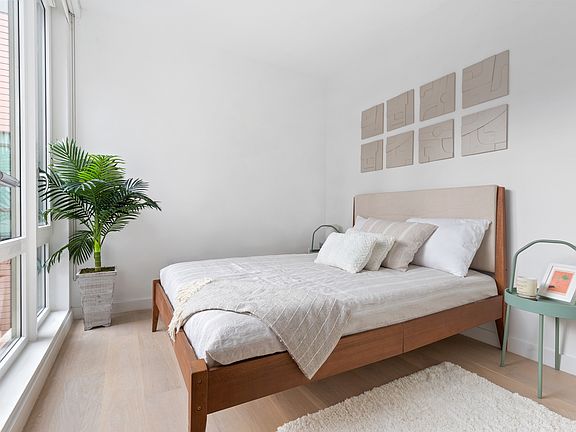 Contemporary fixturesAccented by oversized windowsWide-plank white oak flooringStone tilingQuartz waterfall peninsulaIn-unit washer and dryerFilled with natural light
