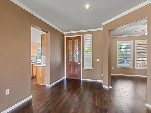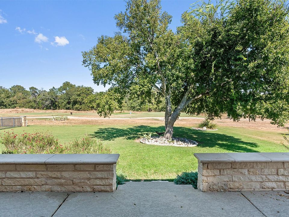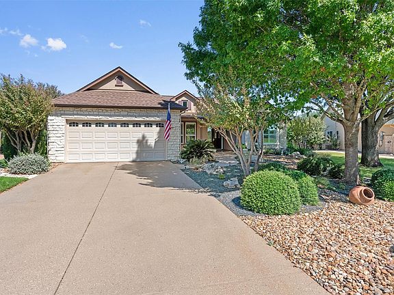 Uniquely situated on a prime cul-de-sac lot, Legacy Hills Golf Course views fill both the front and rear windows of this Sun City Texas Williamson (Trinity) where a four-sides stone exterior adds beauty and easy-care enhancement. After greetings from a Kool Cote driveway and walk, a Front Sitting Porch with an eight-foot entry door welcomes you. Inside, nine-foot ceilings are rimmed with crown molding and most windows are replacements. Off the Foyer, a Study/Computer Room forms a perfect Office-at-Home, where plantation-shuttered twin windows showcase the landscaped front yard with courtyard. Wood floors begin at the Foyer and blanket the living areas, including the Great Room centered by a gas-log Fireplace flanked with deluxe custom built-ins. The Dining portion of the Great Room offers full-view glass doors opening onto an Extended Covered Patio with built-in grill. A gorgeous Sugarberry tree enhances the golf course vista. A granite bar top gently separates the Dining from the Island Kitchen, where Hickory cabinets circle this sparkling Heart-of-the-Home. Unlike most, this Kitchen hosts Two Pantry Closets, while recent stainless-steel appliance upgrades include a Bosch dishwasher. Customized cabinets extend into the spacious Breakfast Room with its dynamite views. At the rear of the home, wood floors continue into the Primary Bedroom, where a wide bay window showcases more golf course views. The en suite Primary Bath hosts dual vanities, a Walk-In Closet and a jumbo Walk-In Shower with seat area. Meanwhile, the Guest Bedroom is adjacent to the full Guest Bath, while nearby a Laundry loaded with custom storage also hosts LG Washer & Dryer with storage platforms and a handy soaking sink. Not seen on all homes of this plan, the Hobby Room is wrapped with custom built-ins and an operable window, ideal for hobbies or bookkeeping. Car Guy, or Gal, not to be missed is the Extended Two-Car Garage with epoxy flooring and side Service Door. *Roof - 2020