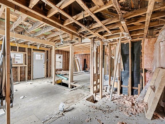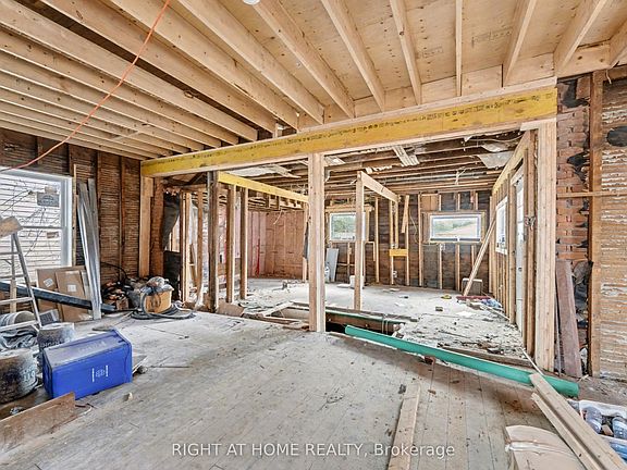 Opportunity knocks in the heart of downtown Oshawa. Opportunity to complete a fully gutted and framed century home in downtown Oshawa. This two-storey brick and vinyl detached dwelling features an open-concept main floor and is framed as two above-ground units (2-bed/1-bath main + 1-bed/1-bath upper). Major upgrades include new roof, modern vinyl siding, updated windows, basement underpinning and waterproofing, Steps to shops, dining, and transit. Sold as-is.