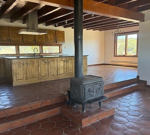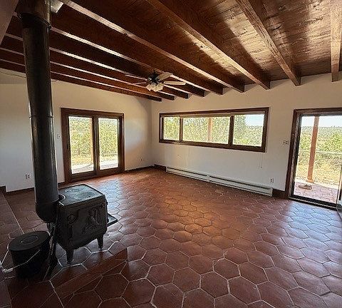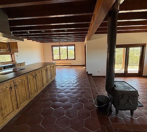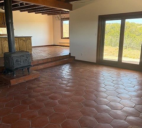 Rare opportunity to live on a historic 550-acre fenced-in ranch! Discover this rustic 3-bedroom, 2-bathroom Ranch House with amazing privacy in a secure and stunning setting. One-of-a-kind High Desert Mountain Ranch retreat rental house offers 360-degree views of the Sangre de Cristo Mountains and Jemez Mountains. This fully gated property with coded entry offers both privacy and security. Located just 6 miles from the heart of Santa Fe, it provides the perfect balance of peaceful living and convenient city access. Once part of a vast 5,000-acre working ranch now known as Las Dos, La Tierra, La Tierra Nueva, and portions of Las Campanas the remaining 550-acre ranch stands as the most stunning and serene stretch of this historic land. Property backs up to vast BLM land. Currently, two Scottish Highlander Cattle (Nancy and Melanie) greet you at the gate and will bring a smile to your face each time. During the daytime or evenings, sit under the covered patio and enjoy a view like no other. Starry nights, afternoon breezes, and tranquility. This bright and spacious home features 3 bedrooms with generous closets and 2 beautifully renovated bathrooms. The open living room flows into a large kitchen and dining area perfect for spreading out and relaxing. The newly updated kitchen includes granite-top bar seating, brand-new stainless-steel appliances (refrigerator, dishwasher, induction range with oven, and microwave), and plenty of counter space for cooking, seating and storage. Enjoy abundant natural light throughout, thanks to numerous windows and two sliding glass doors that showcase stunning views from every room. Mini-blinds offer privacy. The home is freshly painted inside and out, with stylish tile flooring throughout. Both bathrooms have been thoughtfully renovated with new tubs, sinks, fixtures, and tile finishes. A cozy indoor wood-burning furnace (along with baseboard heaters) keeps things warm in the cooler months, and a washer and dryer are conveniently located on-site. Step outside to a spacious wrap-around deck, perfect for relaxing and watching the hummingbirds, while soaking in breathtaking views. The fenced backyard offers a secure desert retreat, complete with a ready-to-plant garden plot ideal for growing your own vegetables or flower bed. Cats are welcome here. There's plenty of open space to wander, unwind, and reconnect with nature. Available for 1-year lease, shorter lease considered. Monthly rent is $3200/month. 1600 Square Feet Interior Living Area. Renter is responsible for electric and internet. Water is provided by well and included in rent. 2 person occupancy. No subletting. Cats welcome (limit 3), small dogs considered, with $500.00 pet deposit per pet. Security deposit due at signing. Pet deposit, if necessary, due at signing. Non-smoking inside. Dirt road access, outdoor parking, no garage. No HOA. There are 3 homes located on the Ranch. This listing is for the lower house, situated on a small ridge.