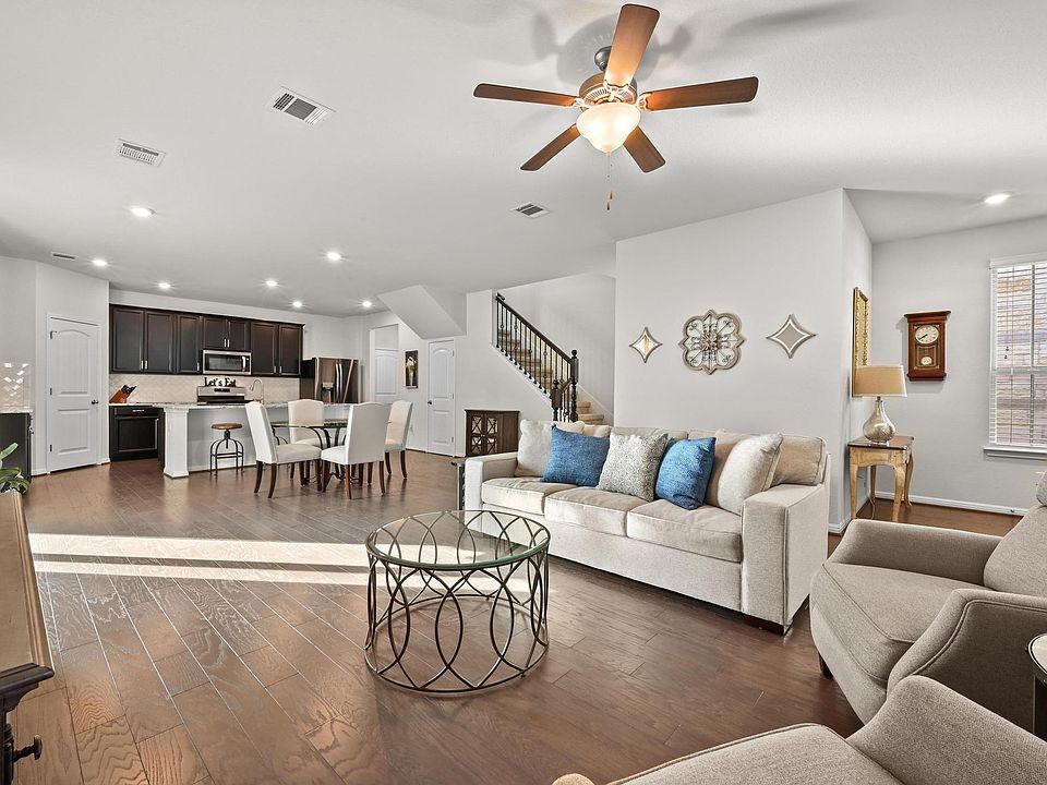 Stylish & Functional, this inviting Texas Heritage Village 3 bed, 2-1/2 bath home is gently lived in with a modern & open floor plan. With a welcoming front porch, the open living to kitchen concept has wood flooring throughout the first level and features a large central island, quartz counters, modern appliances and ample storage. The upstairs is a bright retreat with a 2nd living|game|office space, spacious primary bedroom that opens to a private balcony, and ensuite bath with double vanity, oversized shower & walk in closet. The upstairs is complete with 2 generously sized bedrooms, each with a walk in closet, and a convenient laundry room with storage, utility sink & washer/dryer convey. A mud area with built-in cubbies lead to an attached garage for additional storage. Convenient location with easy access to downtown Dripping Springs, local businesses and walk to Founders Memorial Park.
