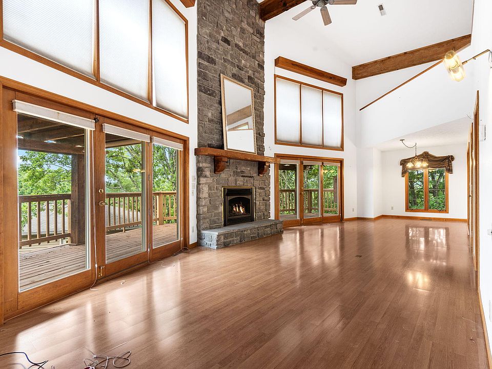 . NESTLED IN THE TREES WITH A TERRIFIC LAKEVIEW is AN AWESOME & UNIQUE METAL LOG-SIDED HOME SITTING ON 1.35+/- acres IS . This 3BR/4BA home with detached 21X28 two-story building previously a woodworking shop. w/room to store your boat has it all. New HVAC installed August 2025. HOME with a Boat slip Available to purchase, has entry with a walk-in sunroom for viewing nature & step inside home with a massive ceiling to floor fireplace in the living room meant for entertainment w/sliding doors to the decks both opened & covered for viewing the lake & entertaining. One end of Living Room is opened to a dining area with windows to the back & it is just off a huge kitchen w/ample cabinets w/all appliances to stay, a large walk-in pantry, a separate utility room w/ deep sink & off LR is a1/2 half bath. The Master BR offers spacious room w/enough room for a sitting area or small office in the Bedroom. The Master BA has double sinks, a walk-in shower & steps up to the jetted tub. Side door off kitchen is a closed deck & door to the 2-car detached garage wi/pull down ladder & storage. Going upstairs at the house find 2 nice sized Guest BR's & Jack & Jill BA in-between along w/an area for entertainment for your guest to relax overlooking the living room. In the Lower level find the large family room w/the pellet free-standing Fireplace w/great area designed for your office & another 1/2 bath. Step out the door onto a walkway to the detached 21X 28 building w/the top floor perviously been used as a wood-working shop & the lower level is a 2- car garage or place to store your boat or anything else. . Oh the Decks...well check out the views from the main level covered or uncovered decks & choose your spot for viewing Table Rock Lake. And, to get on Table Rock Lake just know there is a 10X24 Boat slip available for $$$ is just a hop (minutes) away. Home warranty on this house ready for the next Lake Owner!!!