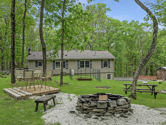 PRIVATE TURN-KEY HOME ON 5 ACRES IN DESIRABLE SCHOOL DISTRICT! Just a short bike ride to the lake, find this completely updated and magical 3 bedroom, 1 bonus room, 2.5 bathroom raised ranch! Front porch perfect for family time! Inside modern color palette, open living & dining areas - huge eat-in kitchen with tons of cabinets, counter space, and large windows! Large, bright master ensuite with jacuzzi tub and huge walk in closet! Finished lower level w/ huge, walk-out FAMILY ROOM, BONUS BEDROOM, HALF BATH, & TONS OF STORAGE! Outside, built in ground trampoline, fenced in playground, majestic gathering spots in the woods for dining under the stars or play time w/kids, & the best views of nature! Huge utility shed! Secluded 5 acres includes 16 separate parcels. See 3D virtual tour!