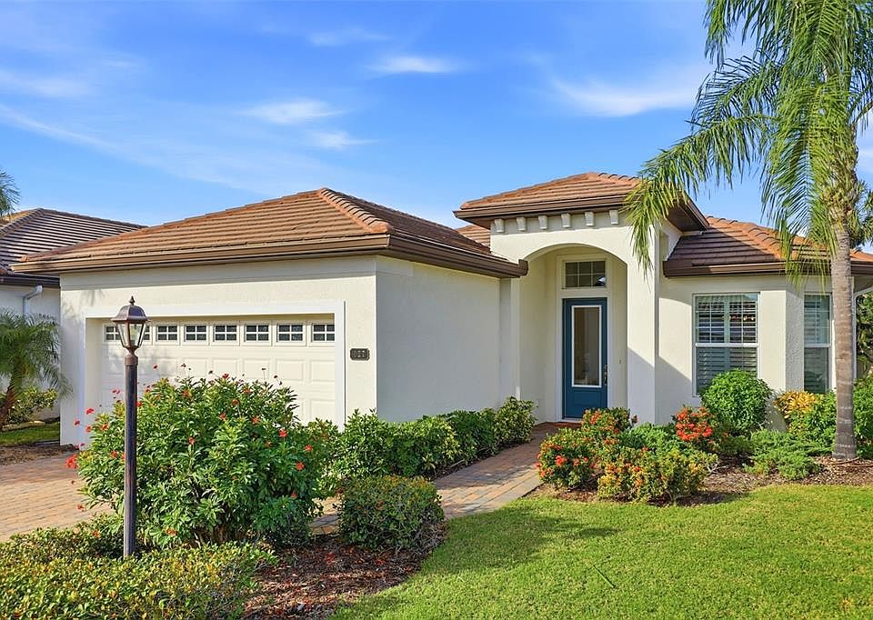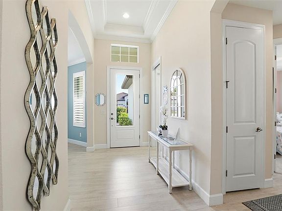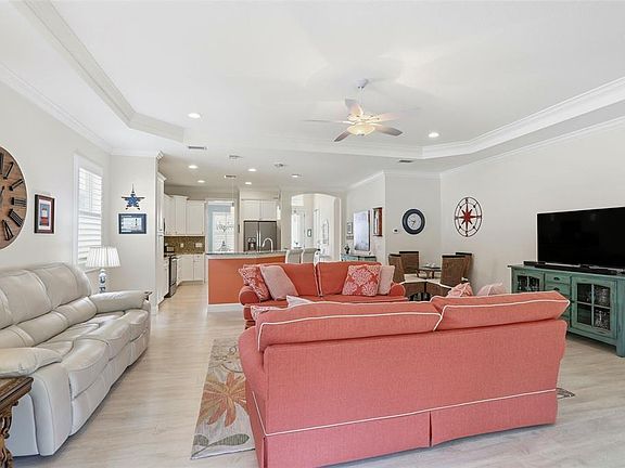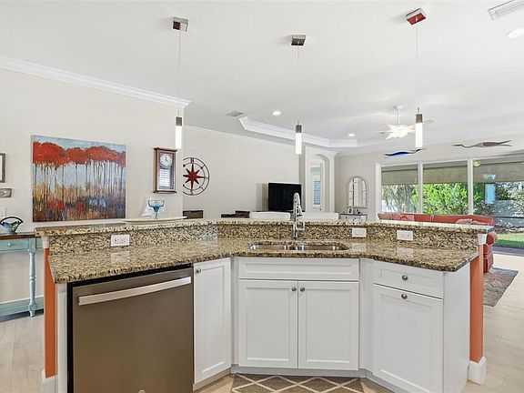 CONVENIENT LOCATION AT GRAND OAKS just 3.5 miles to downtown Venice and easy access to highways, beaches and shopping, delightful 3 bedroom, 2 bath home with 2 car garage, tile roof and rain gutters, built 2016, wind rated doors and windows, interior features luxury vinyl flooring, white plantation shutters, crown molding, spacious kitchen with granite counter tops, stainless steel appliances, white cabinets, breakfast bar, pantry, inside laundry room, 4 ceiling fans, entry foyer, large dining room with seating for six, subdivision clubhouse includes heated swimming pook, heated spa, extra parking, 2 gates serve the community, the main gate is located on Venice Avenue, NO CDD, HOA maintenace fee $367 per month includes lawn maintenance, clubhouse, pool, spa, entry/exit gates, paver brick driveway and screen porch, some furniture may be included, this home is a true 3 bedroom plan with no den, primary bedroom has 2 walk-in closets, light, bright floor plan.