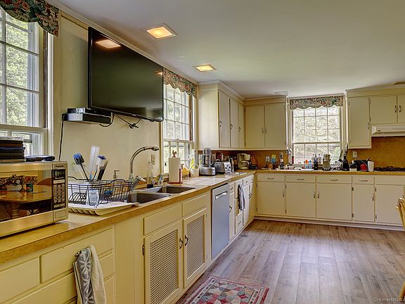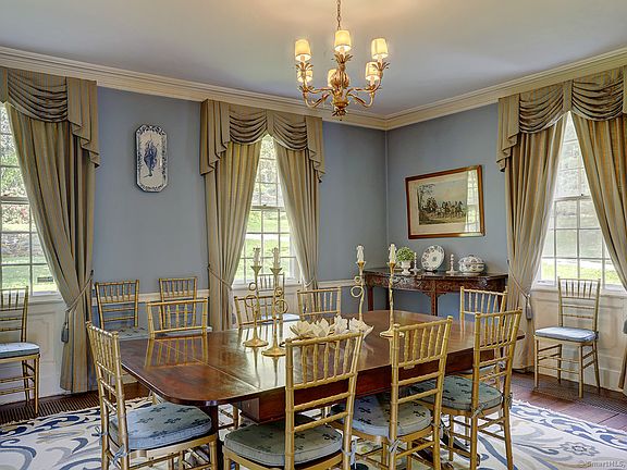 This grand 1805 Colonial has high ceilings and original details including many triple-hung windows, fireplaces with carved stone surrounds and mantles, and wide board floors. Torrington House, so named because it was moved from the Torrington area years ago, sits on 80.84 private, picturesque acres along Old Goshen Road in Norfolk, CT. Through a side door enter the bright, country eat-in kitchen with banquette. A swinging door takes you through the bar to the dining room with nine foot ceilings, chandelier, and fireplace with marble hearth and carved mantle. On the other side, and off the front hall, are multiple entertaining rooms including a formal living room with vaulted ceilings and double doors that open onto a back terrace, a living room and library each with original triple hung floor to ceiling windows and wide board floors. Upstairs you'll find another four bedrooms,in addition to the two below, and an office. Two of the upstairs bedrooms also have fireplaces. Beautiful grounds with views. Multiple outbuildings, terrace, tennis court with viewing stand, wine cellar, and even a screening room.