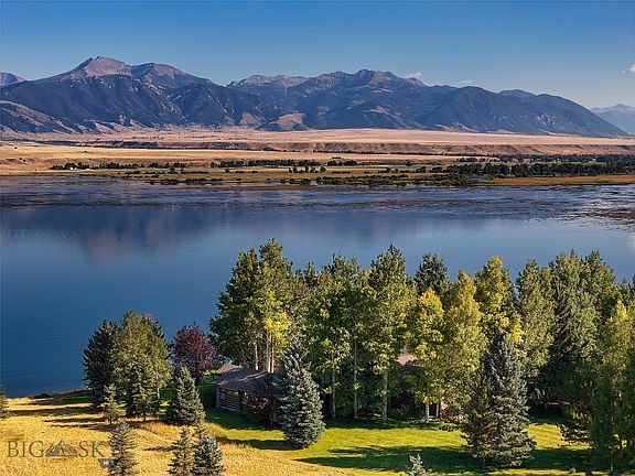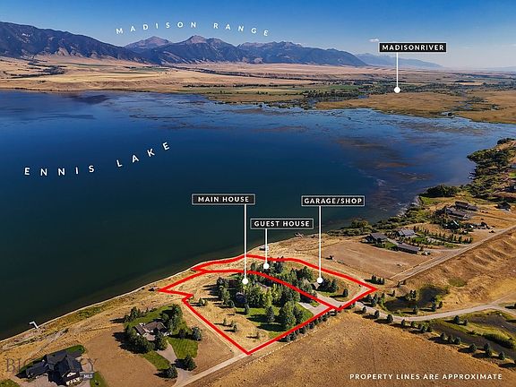 Experience the ultimate Montana lifestyle with this stunning 3-bed, 4.5-bath main home and 1-bed, 1-bath guest home on the shores of Ennis Lake. An oasis amongst mature trees with panoramic views of both Ennis Lake and the Madison Mountain Range, this 4,747-square-foot single level residence offers a rare blend of luxury, privacy, and natural beauty. Designed for hosting both large and small gatherings, this exceptional home is a sanctuary where modern comfort meets the rugged charm of Montana’s breathtaking landscape. The primary suite includes two full bathrooms, and two walk-in closets. The additional two ensuite bedrooms have tall ceilings, adding to the spacious feel of the home. The formal dining room flows into the living room, where a cozy fireplace creates a warm atmosphere. The well-appointed kitchen includes Wolf cooktop, dual wall ovens, warming drawer and microwave, a pantry, and a breakfast nook that takes in morning lake views. The 1,200 SF, 1-bed, 1-bath guest house sits lower on the property, offering 180-degree views. The guest house includes a full kitchen and is perfect for visitors or as a potential rental. The outdoor spaces are equally impressive, with a covered patio featuring its own fireplace and a well-placed fire pit overlooking the lake. An attached 2-car garage offers convenience, while a 4-car detached garage with two additional rooms provides flexible space for a gym, tack room, or craft room. A large 28x44 shop offers ample storage for larger equipment. This property, sited on multiple lots, offers lake front living with the ability to add your own dock. Lakeview covenants allow for vacation rentals in the guest house. Located less than an hour from Bozeman and just 10 minutes from the charming town of Ennis, this property is within easy proximity to amenities. The Big Sky Airport (KEKS), with its 7,600’ runway servicing private jets and small aircraft, is only 20 minutes away. Situated at the base of the Tobacco Root Mountains, this home is surrounded by outdoor recreational opportunities, including hiking, hunting, mountain lakes, and year-round activities on Ennis Lake. Whether you're into waterskiing, stand-up paddle boarding, windsurfing, fishing, or ice fishing, the area offers it all. Yellowstone National Park is nearby, placing you in the heart of Montana’s adventure paradise. This luxurious property combines stunning lake views, well-designed living spaces, and prime outdoor access in a beautiful setting.