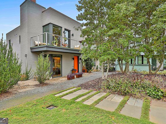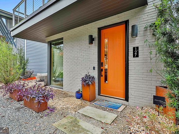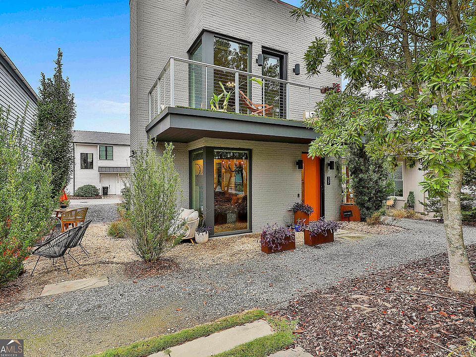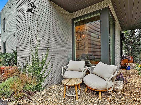 A rare all-brick modern mid-century residence, this two-story home is designed in a perfect three-suite configuration, each bedroom a private retreat, with one primary suite conveniently located on the main level for ease of transition. Thoughtfully appointed by the owner, the home features custom designer lighting, refitted Cafe appliances including a dual-fuel double range with six gas burners, full-size refrigerator, and matching dishwasher. Both the front and balcony doors are fitted with disappearing screens, allowing fresh air to flow freely through the space. Freshly touched-up interior paint complements the newly repainted exterior, while the geothermal system has been regularly serviced and the home fully inspected in 2025. The kitchen is a true centerpiece, featuring a scullery pantry with custom cabinetry, a generous island with three-sided seating, hidden spice and flour drawers for the avid cook, and freshly repainted cabinetry topped with new quartz countertops replacing the original marble. Every detail reflects quality and comfort: custom built-in closets, Hunter Douglas blinds, and pecan wood automatic shades in the living room and upstairs master add warmth and understated sophistication. A versatile niche under the staircase doubles as an office or storage depot, supporting both simplicity and refined living. Outdoors, the home faces Bellwether Park, complete with a wood-burning fireplace and grill area, ideal for gatherings. Positioned on a coveted corner lot, the property enjoys one of the largest courtyards and parking areas in the community. From the upstairs balcony off the master suite, enjoy tranquil views of the lake and park-an elegant, move-in-ready home blending modern Trilith offers the rare balance of indoor-outdoor living, vibrant social connection, walkable stores and restaurants and restorative nature. Enjoy weekly Mahjong, pickleball, cornhole, festivals, and spontaneous dog-park meetups, or find quiet refuge along shaded walking trails, lakeside paths, and pocket parks. Located just 15-20 minutes from the world's busiest airport and ~20 miles from downtown Atlanta, Trilith combines convenience with calm design, craftsmanship, and ease of living.